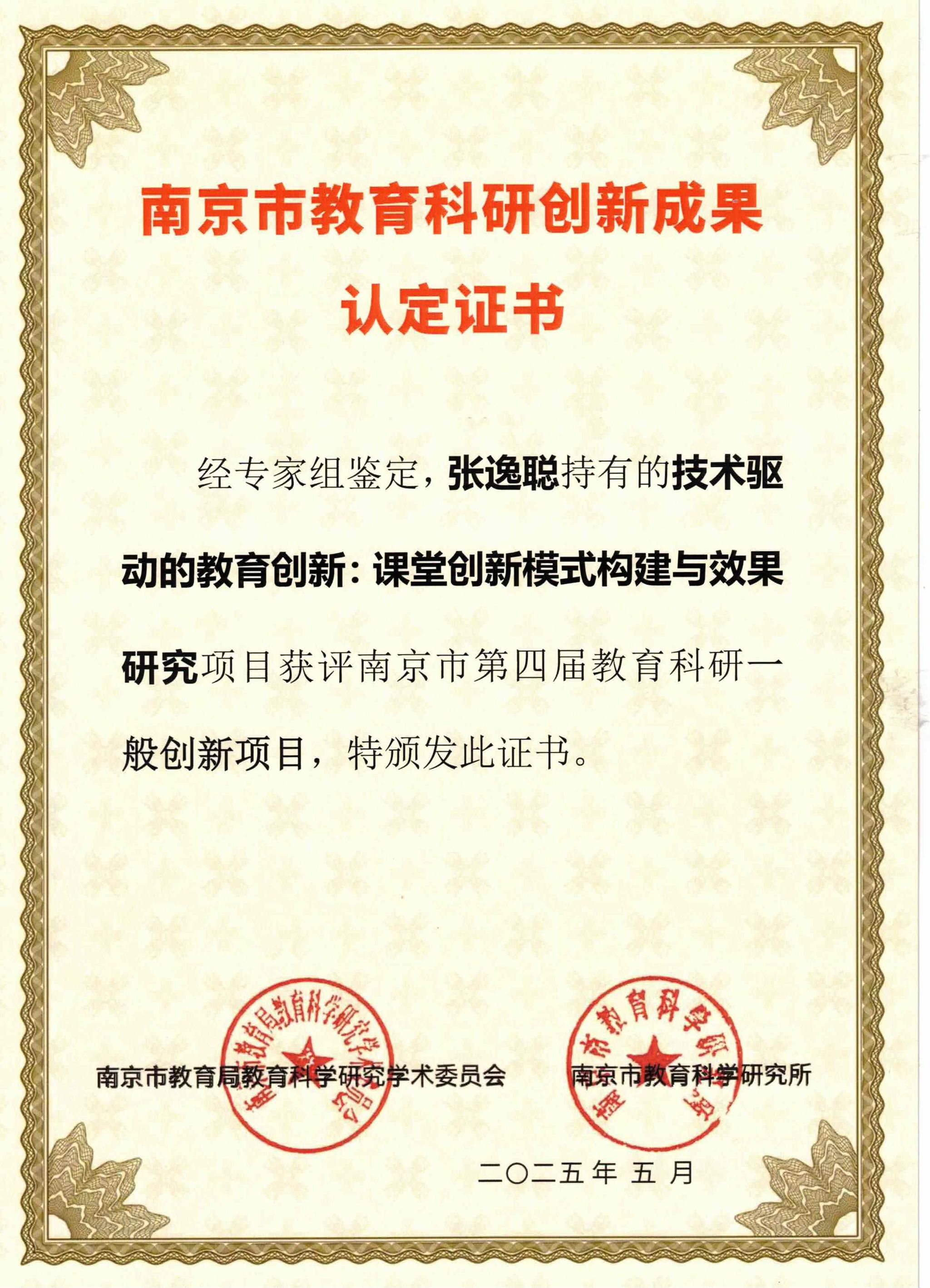 我校张逸聪老师获评南京市第四届教育科研创新奖12月11日,南京市教育科学研究所下发了“南京市第四届教育科研成果创新奖”的认定证书,我校张逸聪老师的《技术驱动的教育创新:课堂创新模式构建与效果研究》项目凭借鲜明的创新性和显著的实践价值,成功获...