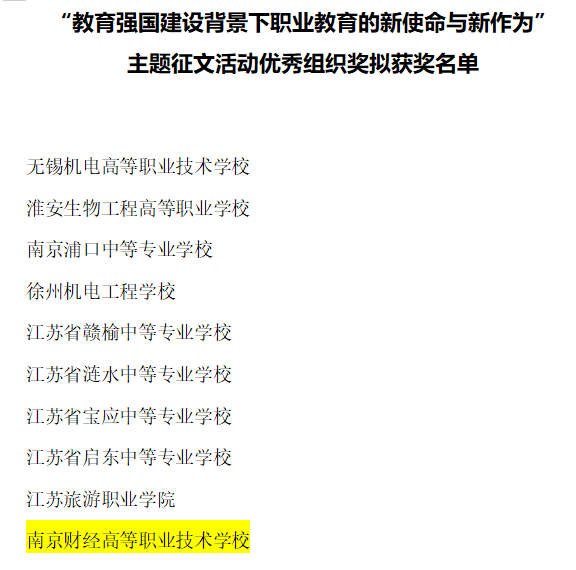 我校在省职教学会主题征文活动中喜获佳绩近日,江苏省职业技术教育学会对“教育强国建设背景下职业教育的新使命与新作为”主题征文活动拟获奖名单进行公示。我校在本次活动中表现突出,荣获“优秀组织奖”;同时共有11篇教师论文获奖,包括一等奖1篇、二等...