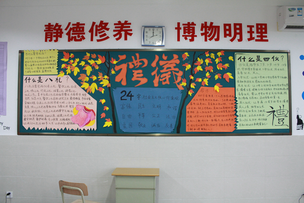 为加强校园精神文明建设,营造良好的校园文化氛围,培养学生爱校如家的意识,学校会计系江宁校区于11月25日举行了以“八礼四仪”为主题的黑板报评比活动。