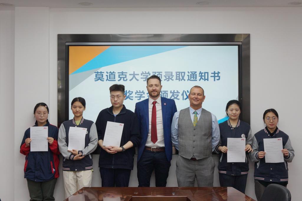 交流会上,澳大利亚莫道克大学和WAIFS学院联合授予学校“最优中澳合作办学学校”铜牌。邱诗轩等五位同学获得莫道克大学预录取通知书,并被给予特批的25%学费减免奖学金。明年7月,这群优秀学子将飞赴澳洲开启全日制本科学习新征程。此外,中澳双方还互赠了具有地域特色的礼物。