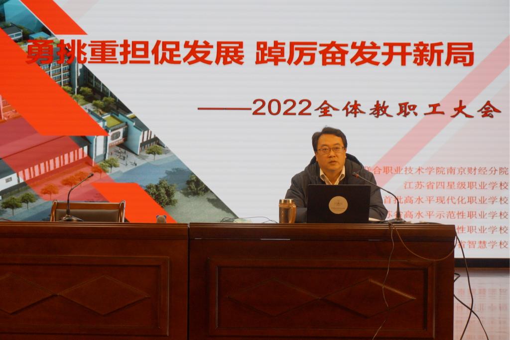 2021年是党的百年华诞,是学校“十四五”事业开端之年,在市教育局等上级部门的正确领导下和全校教职工的不懈努力下,学校以改革创新为动力,团结一心、攻坚克难,在扎实做好新冠疫情防控基础上,推动学校各方面事业不断取得新的突破,为党的百年华诞献礼。学校获得南京市学校安全工作优秀单位、南京市践行社会主义核心价值观示范学校、江苏省中小学校“一校一品”党建文化品牌项目、脱贫攻坚工作嘉奖集体、南京市思政育人特色学校、南京市教育新闻宣传工作先进集体、全国禁毒知识竞赛先进集体等荣誉称号,育人成绩斐然。姚校长从管理机制日益完善、安全综治保障有力,教学质量稳步提升、课程思政不断创新,育人体系特色突显、德育工作扎实高效,学生能力全面发展、招生就业规范有序,教师队伍德技并修、科研引领成果丰硕,校企合作快速拓展、产教融合日渐深入,主动发挥自身优势,社会服务精准有力等七个方面对2021年各项工作进行了全面的总结梳理。