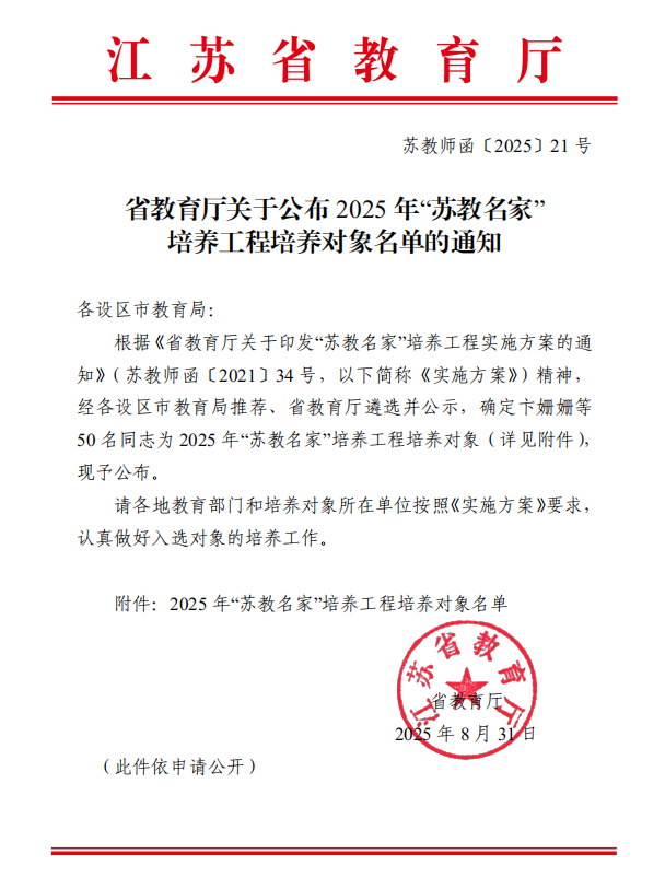 日前,江苏省教育厅发布了《2025年“苏教名家”培养工程培养对象名单》公示文件,我校副校长薛飞成功入选,成为本批次培养对象。