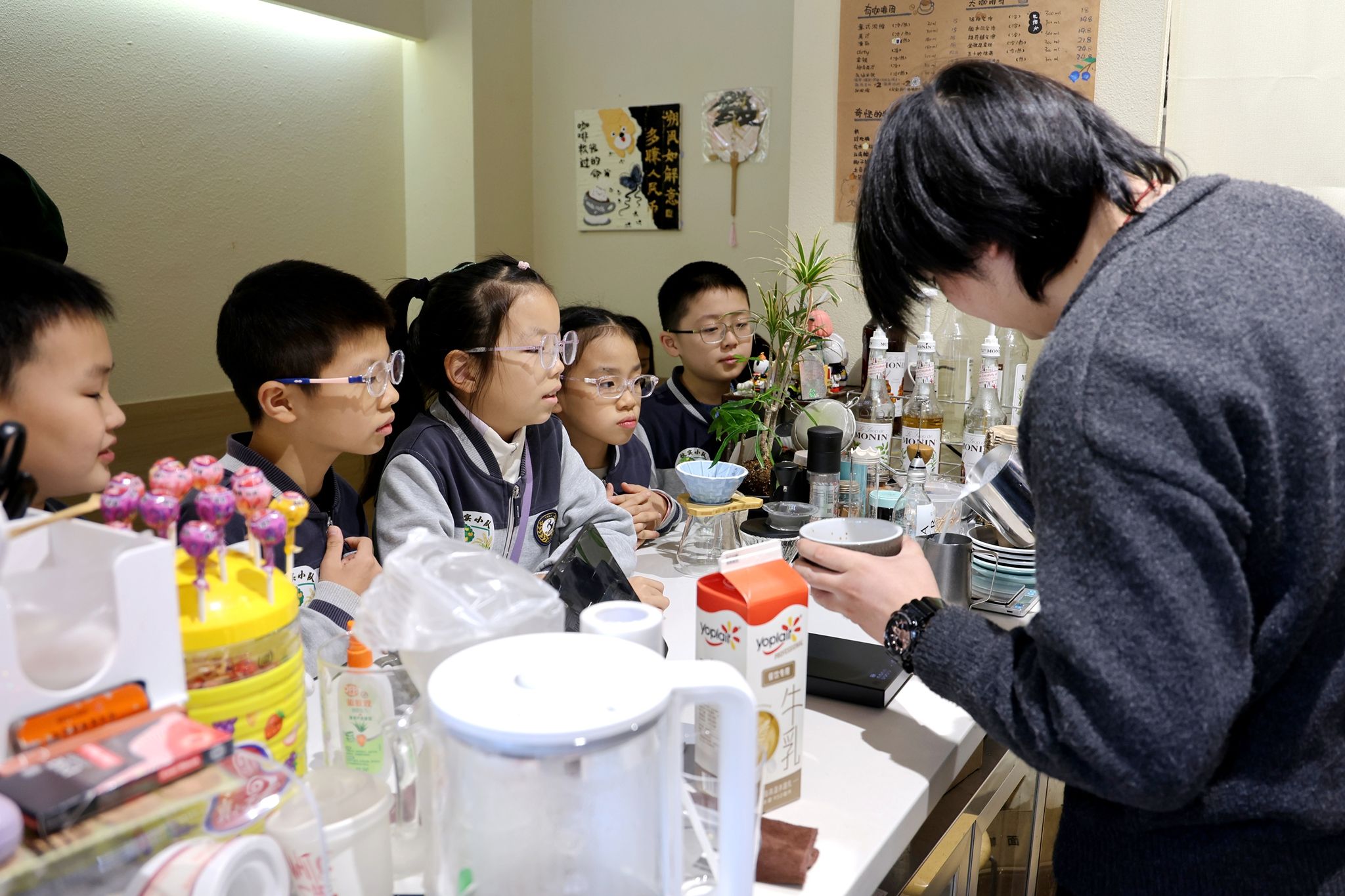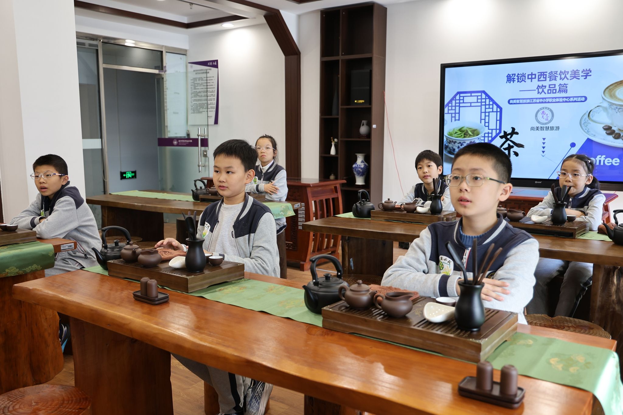 10月23日,一场别开生面的职业启蒙与美学教育课正在我校尚美智慧旅游江苏省中小学职业体验中心生动上演。来自拉萨路的五年级学生们在“解锁中西餐饮美学——饮品篇”的职业体验活动中,亲身体验了中式茶艺与西式咖啡的魅力。