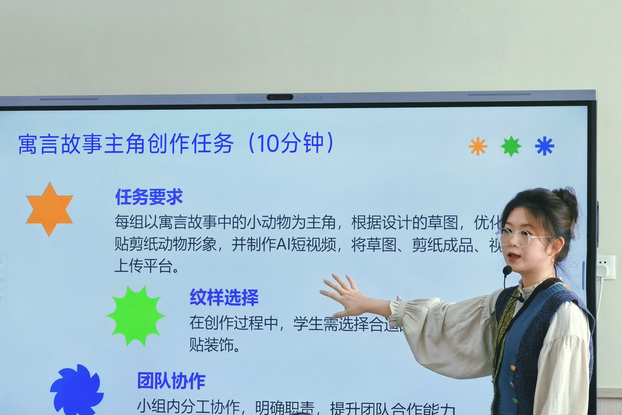 在教学中,四位教师结合婴幼儿托育服务与管理专业的教学目标,引导学生“先感知后创作”。张玎雅老师通过触摸不同材质激发触觉感知,引导学生设计“触摸墙”;缪玥老师让学生感受民间艺术家的精神与自然形态,进而创作剪纸作品;陆菲老师从聆听自然声响入手,将节奏转化为幼儿音乐游戏;王巧雅老师则借助音乐与绘画引导身体感知,创编出融入托育场景的自然主题舞蹈。