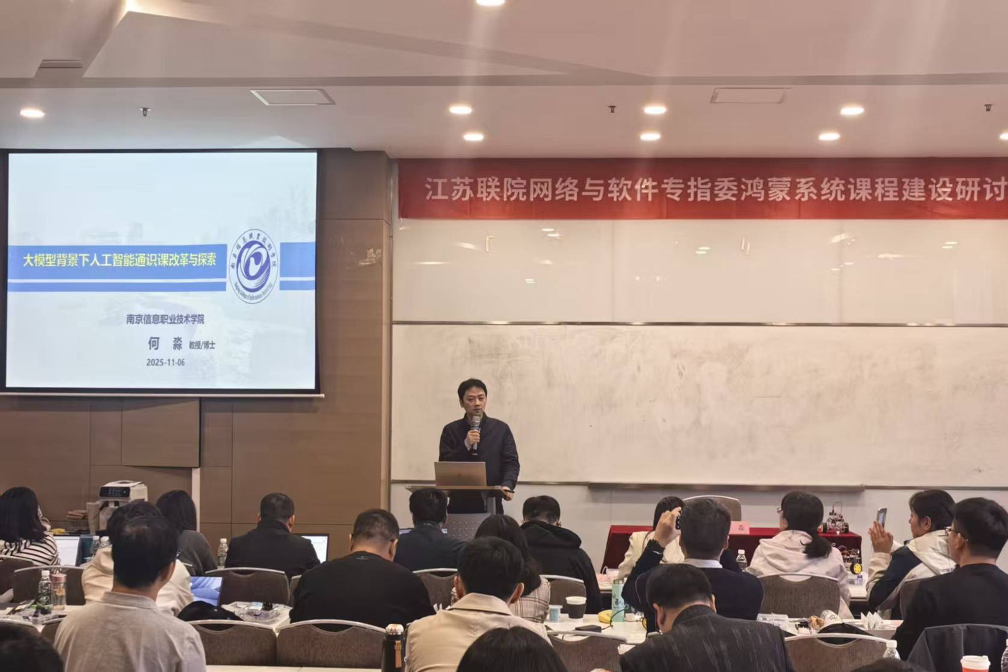 来自南京信息职业技术学院人工智能学院的何淼院长还就《大模型背景下人工智能通讯课改革与实践》作专题报告,为参会教师提供了前沿的教学思路。
