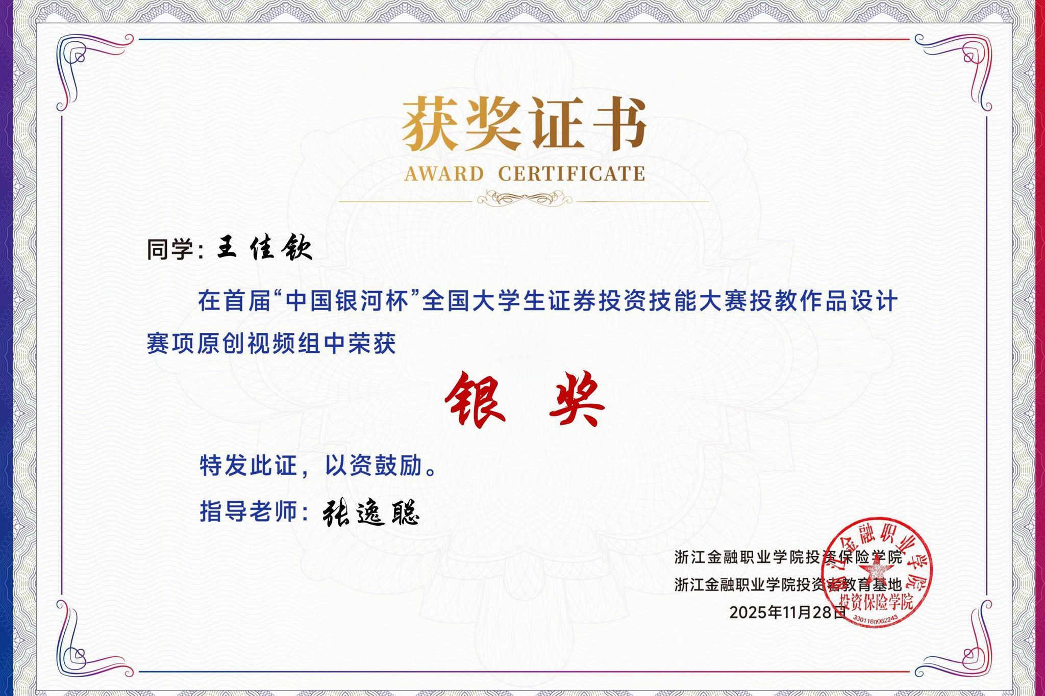 12月15日,2025年“中国银河杯”全国大学生证券投资技能大赛颁发获奖证书。我校由张逸聪老师带领的14名学生在投教作品设计赛项中表现卓越,以原创视频组和原创图文组双赛道齐发,共获2个银奖、12个铜奖。