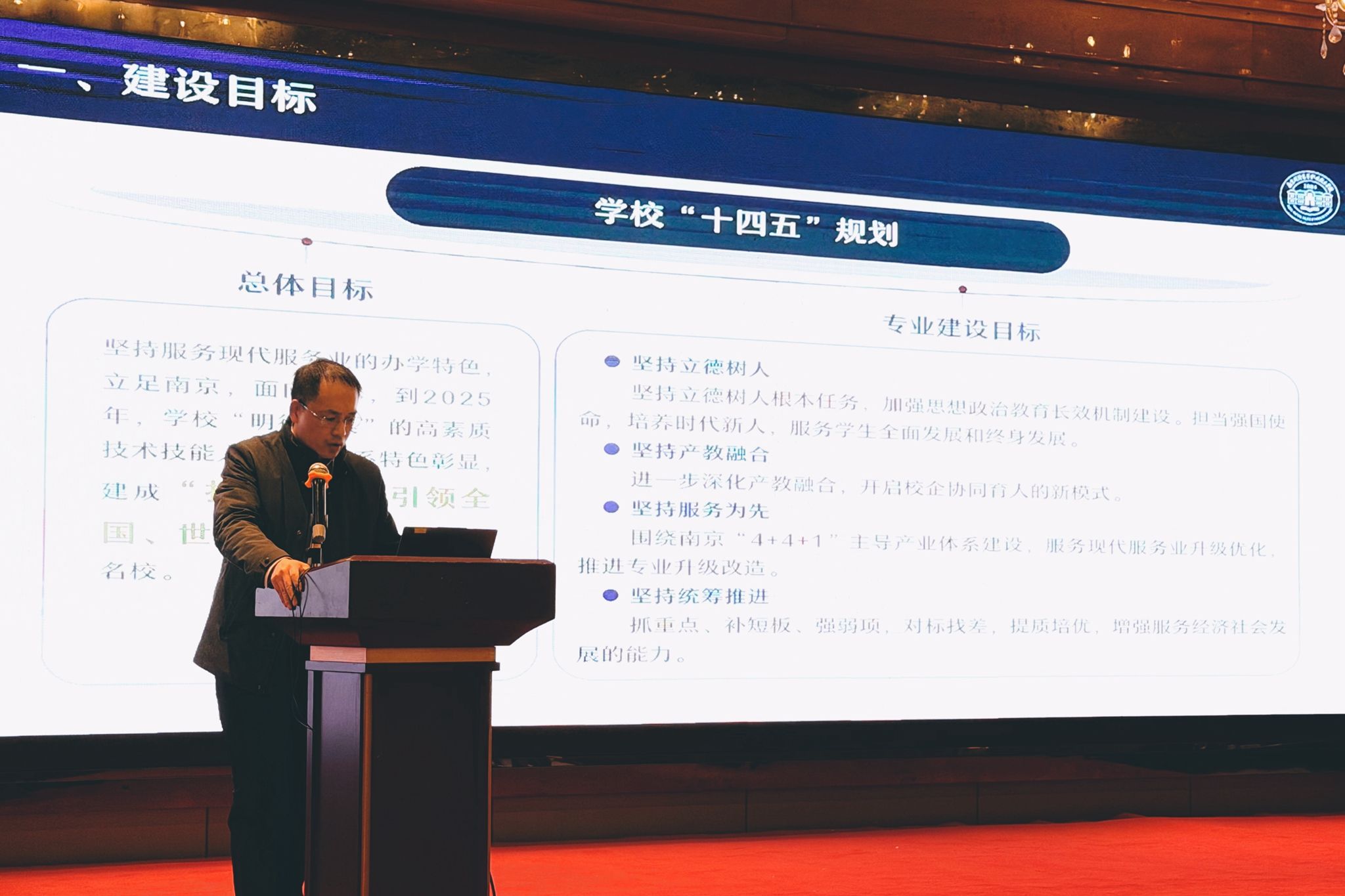 下午会议经验交流环节,薛飞作专题汇报,阐述学校围绕南京产业构建专业集群,聚焦“金课程、金师资、金基地”建设取得的成果,并明确“十五五”期间以微专业赋能和双师队伍锻造为核心的发展路径,获得高度认可。
