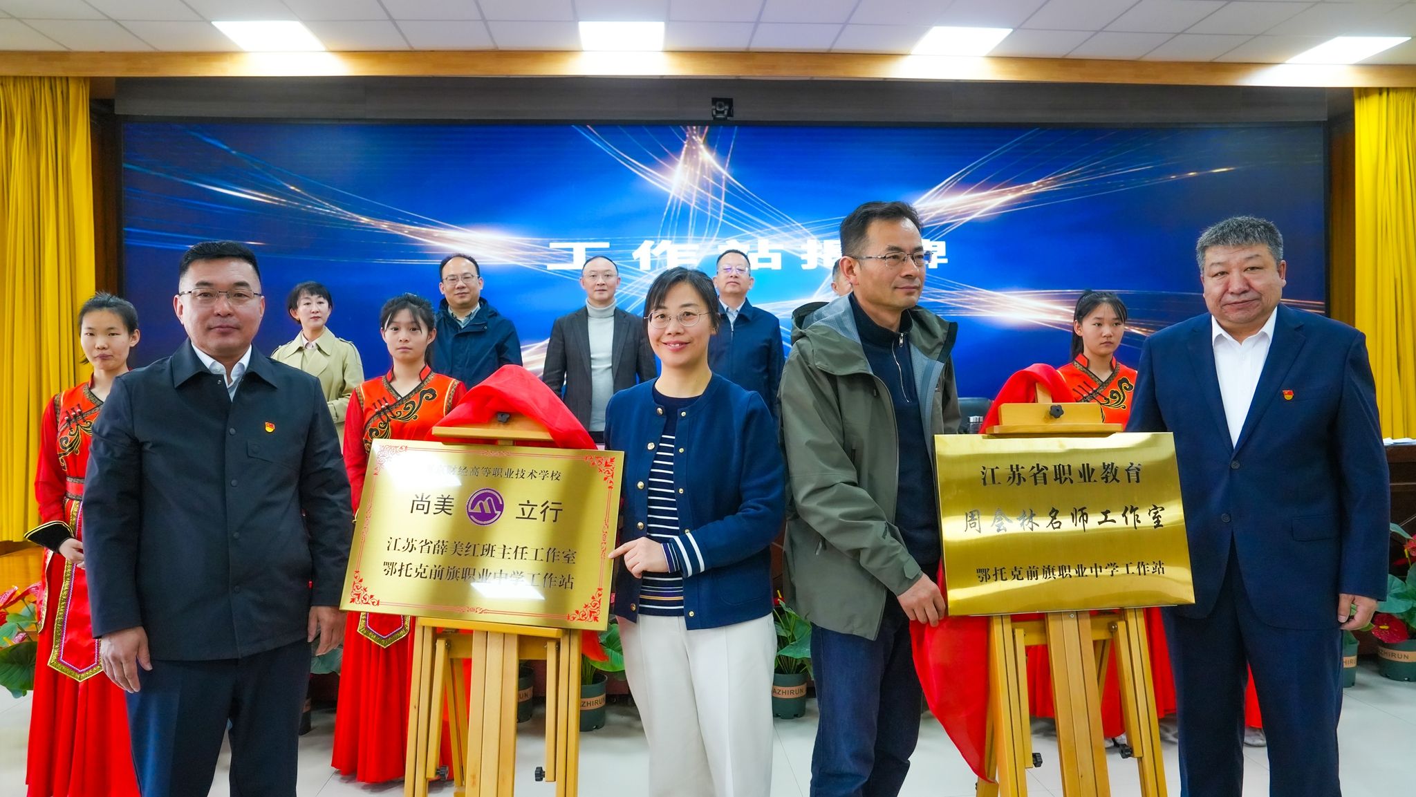 在专项合作仪式上,双方共同解读了项目合作方案,签订了合作协议,并正式揭牌成立“尚美立行江苏省薛美红班主任工作室鄂托克前旗职业中学工作站”“江苏省职业教育周会林名师工作室鄂托克前旗职业中学工作站”。