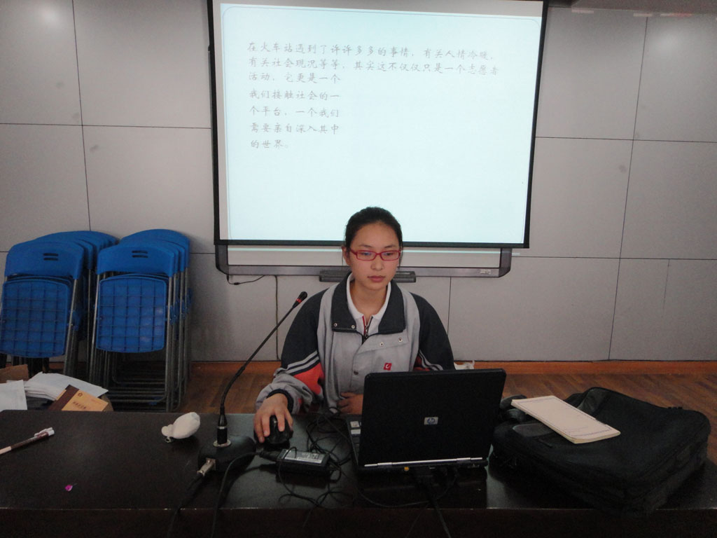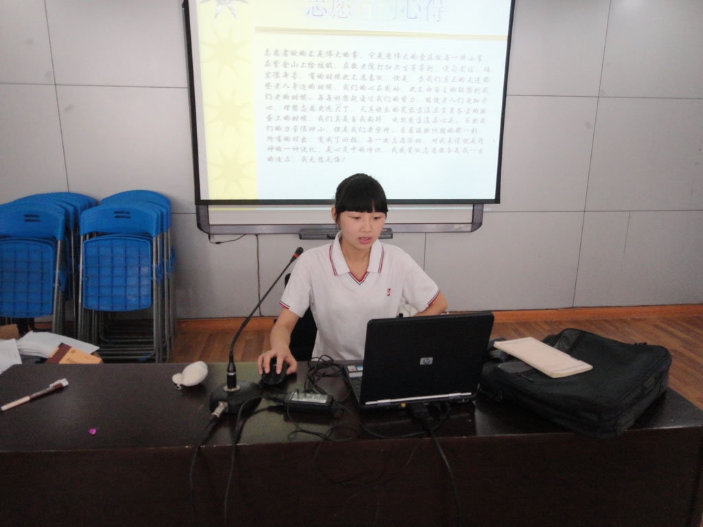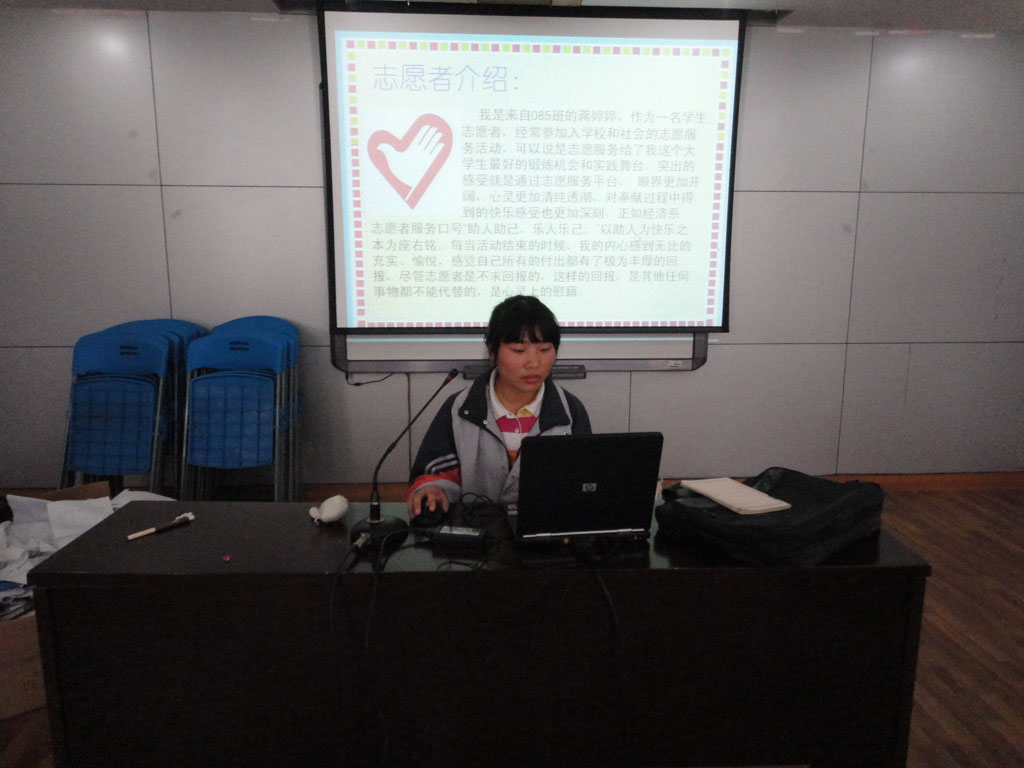 此次展示活动共挑选出了8名志愿者,并于6月24日上午在校一楼报告厅顺利拉开了帷幕。展示过程中,每位志愿者向观众们展示出自己的风采。有的将自己参加日常志愿服务的照片制作成了一张张精美的幻灯片,带领着观众们一起体会志愿服务的快乐;有的则把自己参与过的志愿服务策划成了情景剧,活灵活现地展示在观众们面前;有的则深情朗诵了志愿服务的诗歌,让观众们在耳闻目染中体会到身为一名志愿者的骄傲……活动末,志愿者们分别畅谈了作为一名志愿者的心得感想,以及对未来工作的热情畅想。