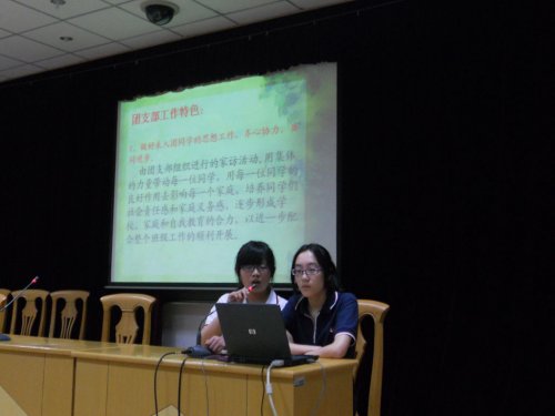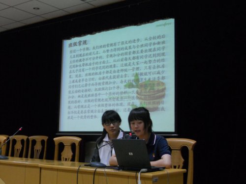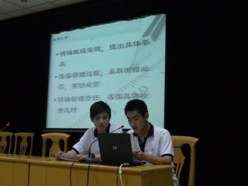 交流中,各班以幻灯片的方式,对本班的班级工作情况进行了汇报。有的班级幻灯片制作精美,不仅图文并茂,还插入了美妙的音乐为背景。从此次班级工作考核中可以看出,操行评分制的细化与实施是提升班级常规管理的有效方法。各班通过实践,不断完善和制定出符合本班实际情况的操行加、减分制度,对学生日常行为进行约束的同时,有效地激励同学们的学习、工作和参与活动的积极性。不少班级还利用教室空间做出了一些人性化的设计,如0902、1006班的生物角、0903班的借伞处、1010、1013班的图书角等等,在教室营造了一个良好的学习和生活环境。在汇报中,092班以班主任为主导,两委干部各司其职,全员参与、共同监督的“自主管理”模式让其他班级的干部有很深的震撼,097班的“家校联系群”为家长们提供了一个及时了解学生在校情况的平台,班委干部的不定期家访更是一种拉近家校距离的方式,也为班干部的能力培养提供了机会。期间,团委学生会干部也积极参与其中,并就各班日常工作中反映出的情况提出了有针对性的意见和建议。
