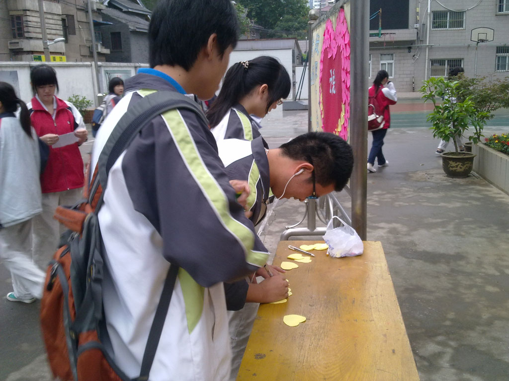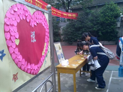 上午7:30,新街口校区学生会同学在校园门口举办了以“感谢师恩,诉说心声”为主题的教师节送祝福活动。同学们早早地把事先制作好的“爱心”型海报置于校门口并向进校的同学们分发“爱心”便利贴,有不少同学停下脚步,主动写下给老师最真挚的祝福,然后贴在海报上,以表达自己对老师的一份心意。没过多久,海报的“爱心”便被贴得满满的,同学们的祝福感染了进校的每一位老师,他们脸上都露出了欣慰的笑容。