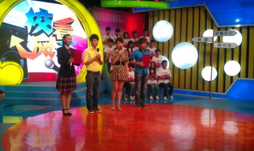 9月26日,我校组织学生参加了江苏电视台综艺频道《校看风云》国庆专题节目的录制。《校看风云》是江苏综艺频道《震撼一条龙》2011全新大型校园风采展示类节目,此次和我校同台比拼的是南京视觉艺术学院。身着统一的职业装,我校16名同学整齐地端坐在观众席上,在领队章莹同学的带领下,形成了一道亮丽的风景线。