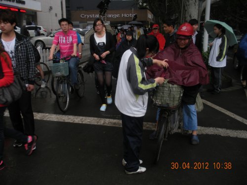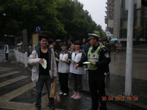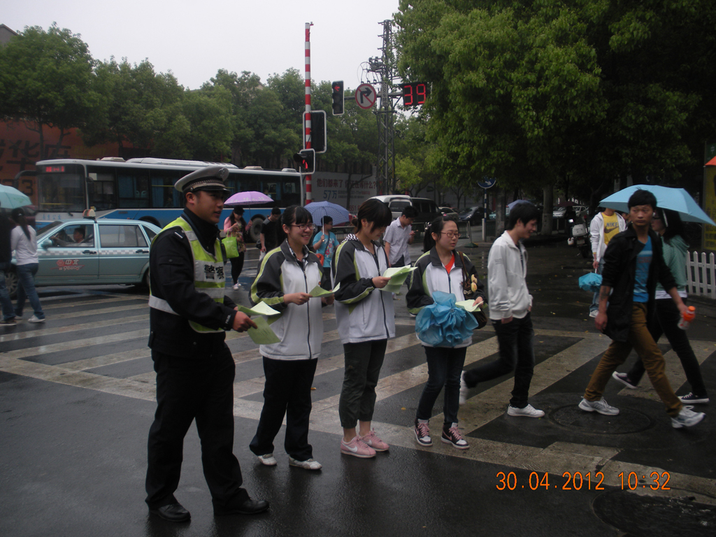 4月30日上午十点整,志愿者们准时在校门口集合,统一前往三山街-水游城十字路口展开活动。此次活动分两部分,一组志愿者给过路行人发放交通安全宣传单,另一组志愿者则在四个行车道口配合交警展开交通协管工作,两个小组同时进行。