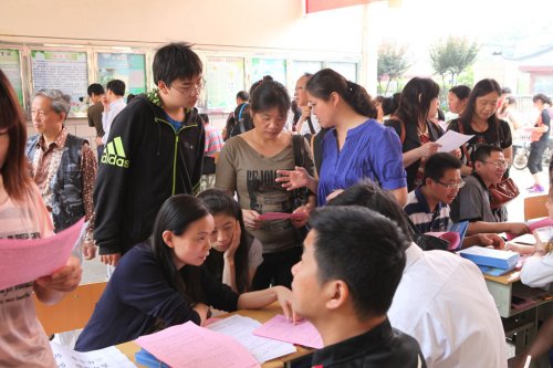 5 月2 6 日,我校在夫子庙校区举行了招生咨询会。虽然天气炎热,还是有很多家长前来咨询,招生咨询台前的咨询家长和学生们一直络绎不绝,走道里、报告厅里站满了学生和学生的家长,招生就业办公室也被家长挤得水泄不通,二十多名工作人员与家长进行了面对面的交流。