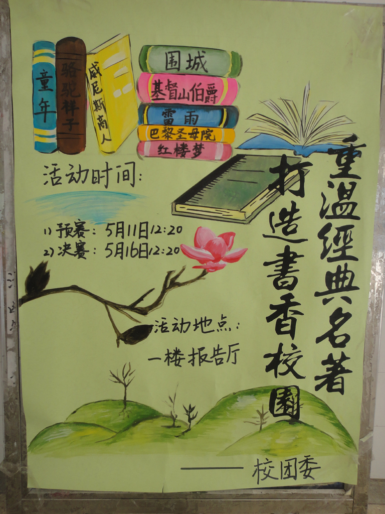 为了提升同学们的文学素养,激发阅读兴趣,养成多读书、读好书的生活习惯,努力营造一个浓厚的校园读书氛围,我校团委于2012年5月11日在新街口校区报告厅开展了以“重温经典名著,打造书香校园”为主题的大型知识竞赛活动。