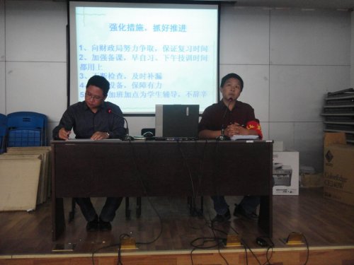 首先,教育教学管理科黄荣桂科长向家长们介绍了学校这项工作的开展情况。黄科长指出,校长对这项工作非常重视,亲自过问、参与。学校在多种场合进行宣传动员,强化任课教师和班主任的目标责任意识。学生在校的早自习、下午技训时间的复习内容作了具体安排。老师安排进班为学生辅导、加班加点,不辞辛劳。为提高工作效率,学校还特意增添了设备,教学管理部门提供有力了保障。