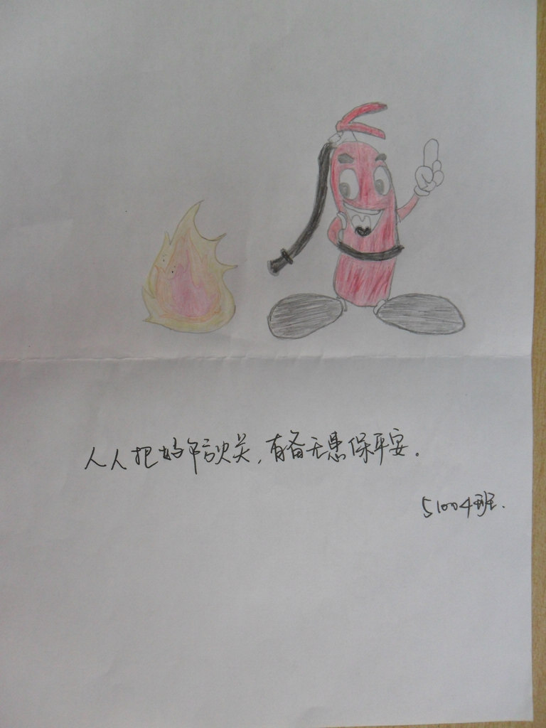 本次活动面向各班征集消防安全标志标语,同学们积极响应,纷纷参与其中。“火灾无情,防火先行”、“人人把好防火关,有备无患保平安”等一条条令人记忆深刻的标语和一个个主题鲜明的标志是同学们积极参与活动的最好见证。经过各班生活委的评比,最终1006、1009、1010班荣获一等奖,1003、1004、097、0910班荣获二等奖,094、1005、1007、1008班荣获三等奖。