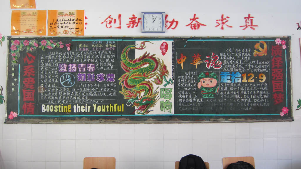 今年是“一二•九”运动七十七周年,我校夫子庙校区开展了纪念“一二•九”系列主题活动,如通过校园橱窗宣传“一二·九”运动,在2012级各班展开主题黑板报评比和大合唱比赛等。