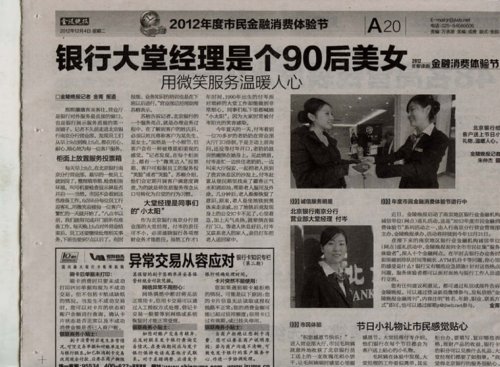 “作为北京银行南京分行营业部的大堂经理,付岑的责任可不小,必须通晓银行各项理财业务才能胜任。虽然工作才一年时间,1990年出生的付岑面对琐碎的大堂工作却能做到非常细心,同事们私下喊她‘小太阳’,因为大家时常被付岑阳光的笑容感染。”这是12月4日《金陵晚报》上《银行大堂经理是个90后美女》中描写北京银行诚信服务明星——付岑的一段话。