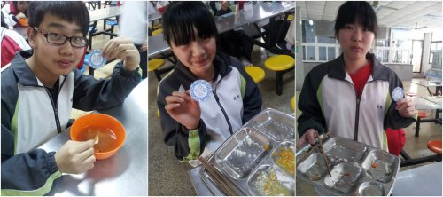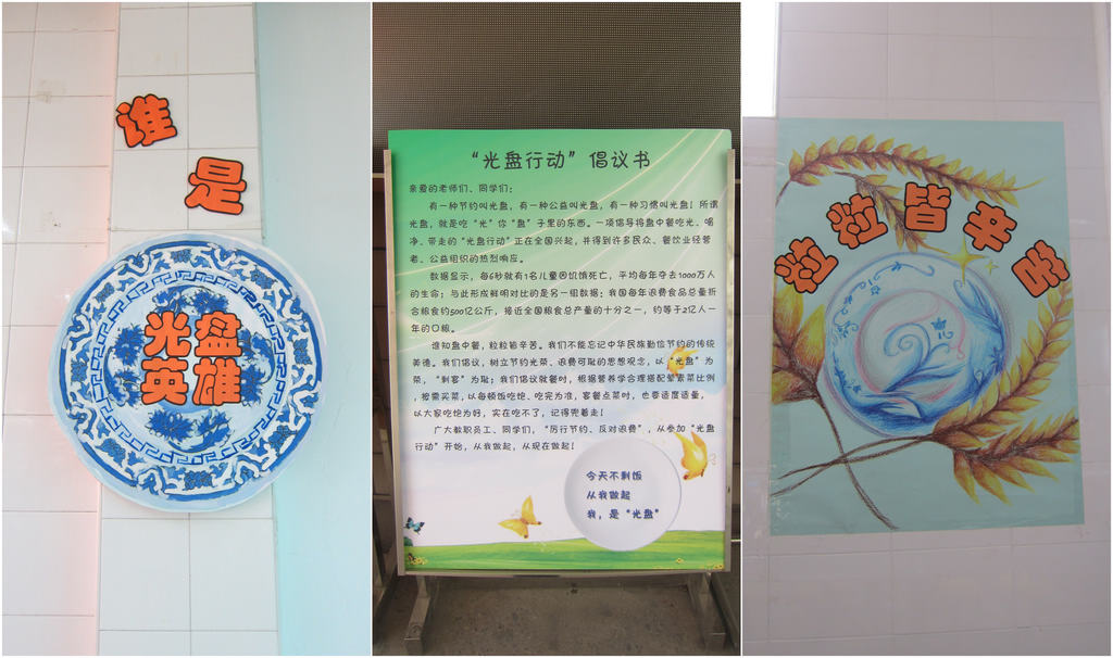 由51211班丁闵同学通过国旗下演讲向全校师生发起《拒绝浪费,从我做起》倡议,鼓励同学树立“节约光荣、浪费可耻”的思想观念,以“光盘”为荣,“剩宴”为耻。校学生会生活部向各班征集了手绘“光盘行动”标语卡片,并张贴在学校食堂的餐桌角上,以此提醒同学们节约饭菜、珍惜粮食。活动得到同学们的积极响应,共收到标语卡片一百余张。51210班的同学们精心设计并制作了“光盘英雄”的胸牌,发给将餐盘中的粮食吃光并主动收拾餐桌的同学。拿到标牌的同学都很开心,感到很光荣,就连一些老师也积极争当“光盘英雄”。此外,学生会宣传部还制作了以麦穗和盘子为背景的主题海报,在食堂内营造了浓浓的氛围。