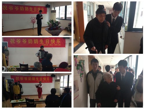 2013年12月14日下午,我校团委组织了十二名志愿者前往鼓楼区允德乐龄老年公寓看望老人,并与南京外国语学校和江苏广电学校的志愿者们一起为老人们组织了一场温馨的庆生会。