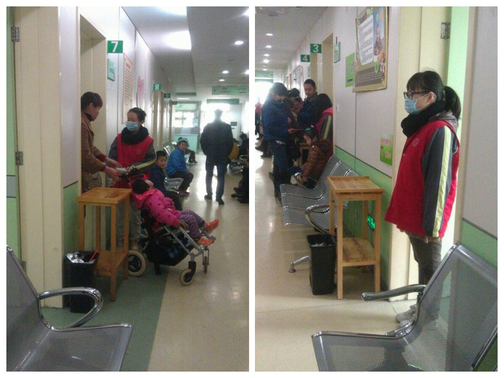 门诊大楼人山人海,休息日仍呈现出忙碌而紧张的场景。志愿者们被安排到各个岗位,身穿医院志愿服务标识的红马夹,不断地穿梭在人群中,用温暖的笑容为每位前来就医的患者服务,如廖超同学主动为就诊病人提供指引,刘君研同学则不厌其烦地为就诊者提供自助挂号的服务。在把关怀带给他人的同时,他们用自己的行动传递了爱心,传播了文明,整个医院环境在志愿者的协助下,井然有序。“谢谢你”、“有困难找红马夹”几句简单的回馈是对志愿者们最大的肯定。