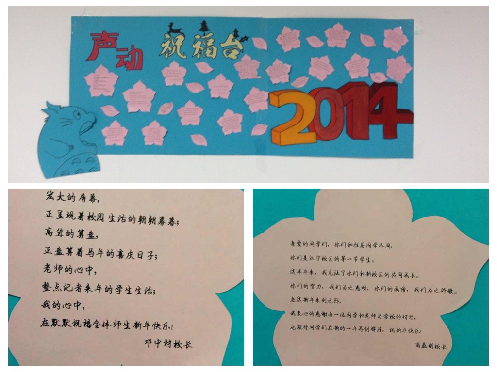 2013年12月31日,在辞旧岁、迎新春之际,为了给广大学子增添元旦到来的欢乐气氛,同时也为缓解同学们期末备考的紧张情绪,我校江宁校区广播台倾情奉献特别节目——“心的祝福,声动校园”,喜迎新年的到来。