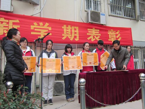 2月24日上午7:40,我校在夫子庙和新街口校区的晨会上,举行了关于全校技能统测竞赛的颁奖典礼。在夫子庙校区,教学科研部陈琴芳主任主持了典礼,陈旭辉书记为获奖班级颁奖;在新街口校区,典礼由学工部许鸣峰主任主持,刘辉副校长为获奖班级颁奖。