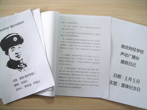 3月5日午间,伴随着歌手王蓉的《我学雷锋好榜样》的音乐响起,我校江宁校区“声动”广播台“雷锋——榜样”专题节目正式开播。这一期专题节目,主要介绍了雷锋同志的光荣事迹,摘录了《雷锋日记》的部分内容,还宣传了当代雷锋——郭明义的感人故事。通过一系列生动翔实的内容,让同学近距离地感受雷锋精神,鼓励同学们学习、继承并发扬雷锋精神,为社会作出自己的贡献。