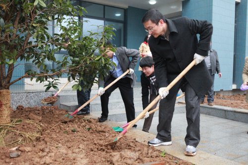 参观完毕后,市局机关全体同志来到校园教学楼的路边,拿起铁锹,在几位局领导的带领下忙碌起来。他们不顾天空中飞舞的细雨和脚下泥泞不堪的泥土,分工协作,动作有力,有的扶正树苗,有的挥锹铲土,有的夯实树根,一排排树苗很快便挺立在我校的校园中。