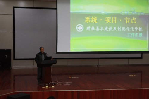 在学校综合楼的报告厅里,邓中材校长做了题为“系统·项目·节点”的工作汇报。邓校长从“领导重视,明确系统工程目标”、“依据政策,搭建项目组织框架”、“狠抓节点,提高管理绩效”和“聚焦新项目,促进财校治理结构现代化”四个方面向各位领导介绍了近两年来学校建设的概况,对市局领导在建设过程中给予的关心与支持表示衷心的感谢,同时汇报了创建现代化学校的进展情况,明确了下一个阶段学校的工作重点和努力方向。