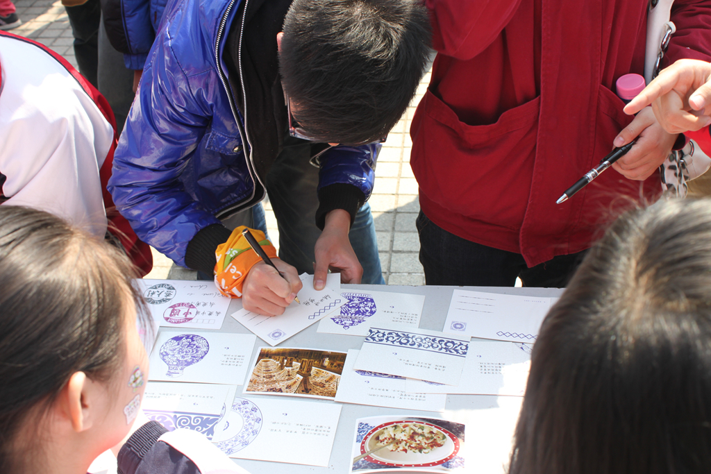 由于小屋内空间的限制,一些体验活动外还被搬到了屋外进行。如手绘明信片、数字油画“蒙娜丽莎”和文化T恤。不少孩子和家长们共同体验了这些手绘活动,并在明信片上写下“祝福青奥、祝福南京”、“南京加油”、“BestwishesforNanjing”等祝福的话语。每一张明信片上,志愿者们都会为他们盖上“意大利2014”和“中国2014”字样的纪念章。活动期间,小屋还吸引了两名意大利的朋友,他们对“意中人”小屋竖起了大拇指。