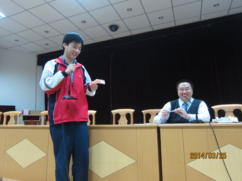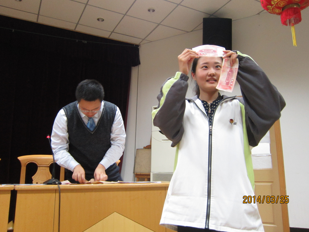 最后压轴的是闭眼识真假钞的比赛,获胜的奖品是一个移动电源。金老师选了男生、女生两组分别PK。经过一系列的角逐,1007班杨志鹏和1009班李莉两名同学都以四张钞票全部辨别正确的好成绩夺取最终胜利。