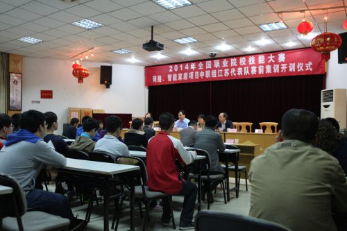 4月11日,2014年全国职业院校信息技术类技能大赛(网络搭建及应用、智能家居安装维护项目)江苏代表队集训开训仪式在我校隆重举行。此次开训是针对我省信息技术类两大项目技能代表队举行的赛前集训和动员。省职教学会张铎副秘书长,江苏省技能大赛集训专家、江苏理工学院吴访升教授、朱林立老师,市教育局潘东标副局长,南京市职教教研室孔晓华副主任,我校邓中材校长、刘辉副校长、信息技术系张翠红主任、薛飞副主任及学校集训工作相关人员,各集训选手所在学校的领导及集训教练和选手参加了会议。会议由学校刘辉副校长主持。