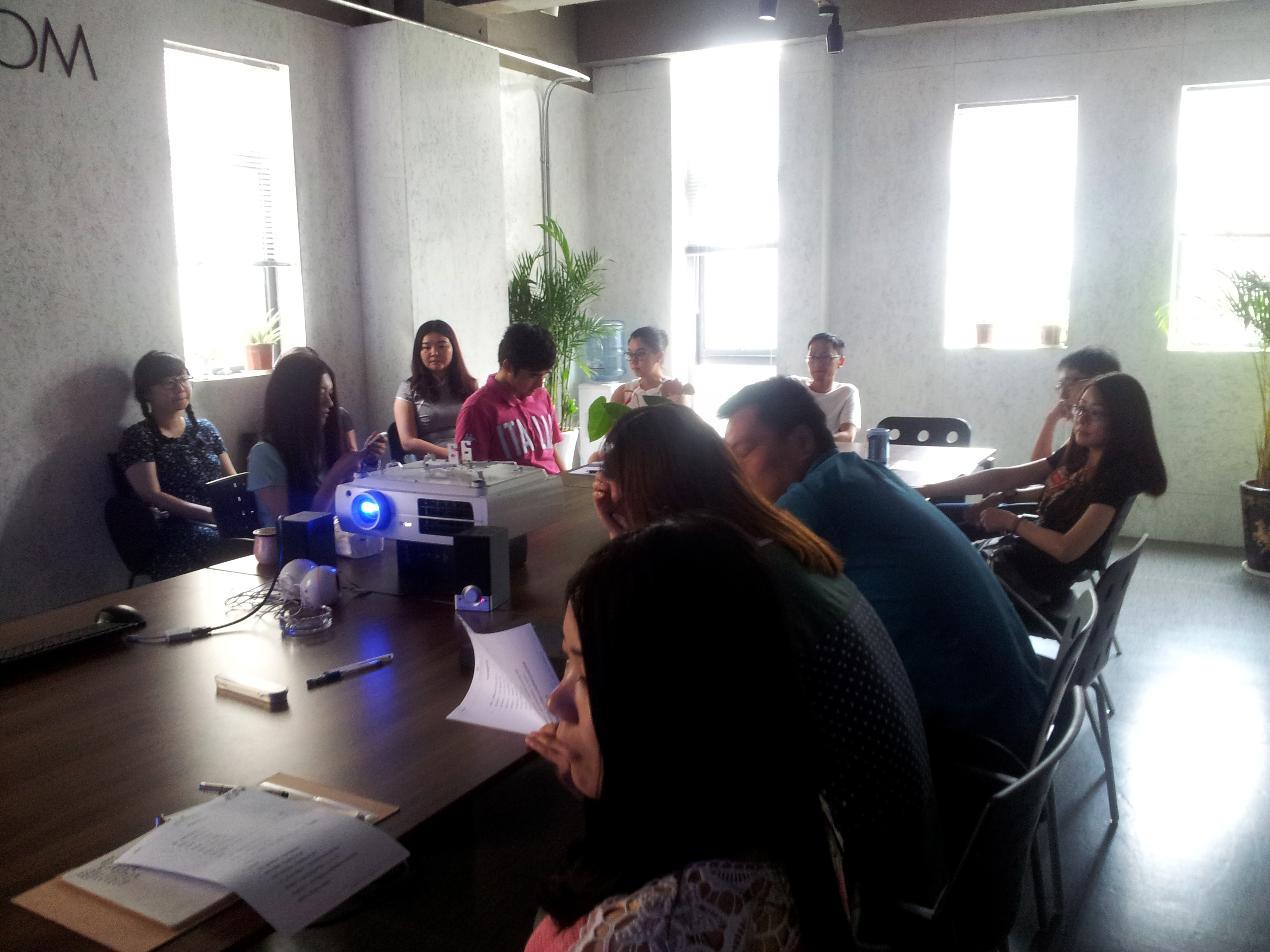 6月11日下午,本次竞聘活动在江苏金橡树影业有限公司三楼会议室举行。除学校季力老师之外,参与此次活动的评委还有:中国资深独立动画制片人姚晓明、导演陆强、副导演甘戍冬、宛新、王丽娟、胡欣。在竞聘活动中,竞聘者依次上台进行演讲(30-45分钟),毛遂自荐。竞聘者们都做了非常充分的准备,演讲内容非常精彩,他们的微电影设计都有独特创意。随后,评委们分别从工作态度、工作经验、个人能力、团队意识、工作思路(可行性、科学性)、心理抗压以及现场表达能力等方面向竞聘者提问。整个活动紧张有序。