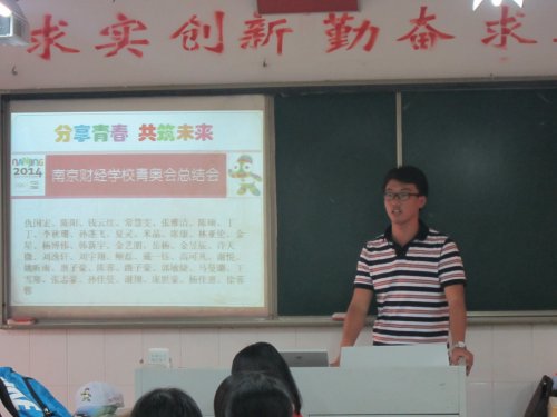 孙书记首先感谢了39名文化教育代表在青奥文化教育活动中做出的贡献,“这既为学校争得了荣誉,也为自己珍藏了最美的青春记忆”。紧接着,孙书记以时间为轴线,用“追逐青春梦”、“分享青春梦”、“共圆青春梦”、“继续青春梦”四个主题,带领大家重回顾了财校青年们四年来追逐青奥梦想的经历。一项项活动,一幕幕场景,都铭刻着每一个财校青年的青春印记,汗水和泪水都凝结为成长的宝石。随后,孙书记带大家欣赏了一组青奥会期间文化教育代表在世界文化村青奥小屋中活动的照片。满载微笑与各种pose的合影让友谊永远定格在青奥的记忆中:夜幕下搞怪的伙伴们释放着一天的疲惫与喜悦;撤场时久久不愿离去的背影则多了些许的感伤和不舍。回忆,是苦涩的,亦是甘甜的,在一张张照片中,大家回味和珍藏着属于自己的青春记忆。