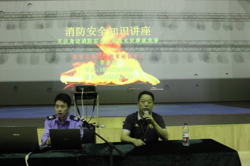 南京安居防火教育中心李金波老师的讲座则侧重于消防安全的相关知识。李老师的讲座既严谨认真,又不失幽默诙谐,场内的气氛马上就活跃起来。但李老师展示的火灾现场的照片也一下子触动了大家的心。讲座中,李老师为大家详细讲解了公交车上安全锤和灭火器的使用方法,还专门拿出安全锤来现场示范。李老师生动的讲解让学生在会心一笑的同时,也将消防意识牢牢地记在了心中。