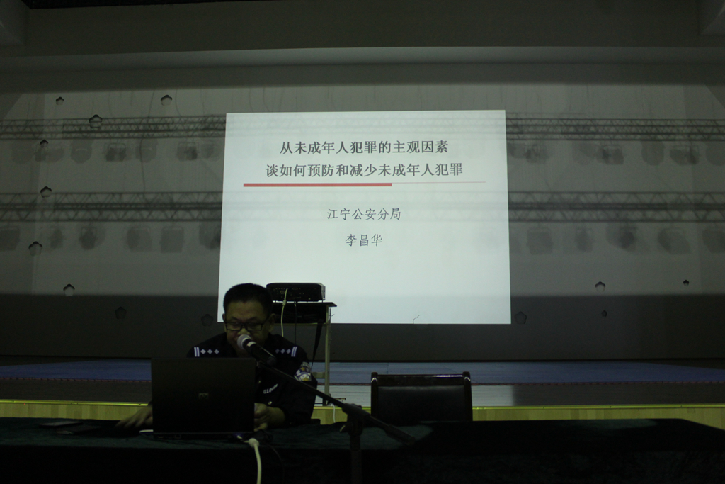 江宁公安局的李昌华警官首先从未成年人犯罪的主观因素谈起,重点介绍了如何预防和减少未成年人犯罪。他在讲座中指出:过度的追求物质享受是未成年人犯罪的诱因;思想上缺乏严格的纪律观念、道德观念和法制观念是青少年犯罪的直接原因;未成年人自我约束不严是导致未成年人犯罪的结果。在说到未成年人犯罪的时候,李警官的话语中充满了担忧,他用发生在现实中的案例为学生们敲响了法制安全的警钟。李警官还特别朗读了一封犯罪人员的忏悔信,使同学们清醒的认识到在生活中必须严于约束自己,养成正确的生活习惯,不滥交友,增强法治意识,远离犯罪行为。