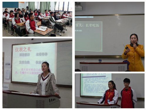 各班同学积极准备,亲手制作了内容丰富、形式精美的PPT课件,并辅以节目表演、辩论等多种方式来了解和学习“八礼四仪”的内涵。其中,1304班采用学生宣讲和表演示范相结合的形式,同学们在欢声笑语中学习走路、坐姿礼仪。而1403班则由班主任宋静老师主讲,从多个方面全面细致地解读“八礼四仪”在学生生活中的表现。1305班级还邀请了张艳老师到班级宣讲,做标准礼仪示范,主题班会现场气氛学习浓厚,取得了良好的成效。