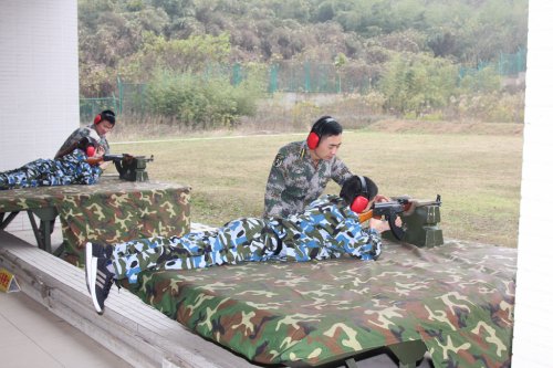 所有训练项目中,最让年青教师们期待不已的就是“实弹打靶”了。很多老师还从来没有摸过真枪,真枪里子弹打出去究竟是什么感觉?大家议论着、猜测着。老师们六人一组,进入打靶场地,每位老师配发了七发子弹,由一名教官进行具体指导。上弹夹、卧倒、瞄准、扣动扳机……“啪啪啪”,当枪声响起时,地面微震,对面的黄土上飘起灰尘说明子弹成功打去。因为缺乏经验,很多老师扣动扳机后,还没有来得及反应,七发子弹就全打完了,只得遗憾地离开靶场。在等候区,老师们无不兴奋地交流着打靶的心得。有的说,开枪的时候震耳欲聋,趴着身体可以感觉地面的震动;有的说,只要按照教官教的“三点一线”瞄准了,肯定能上靶;也有人说,打靶的时候把枪托放稳在肩窝了,后坐力冲击在肩上就一点也不会痛。看来打靶过后老师们各有话说且收获颇丰。