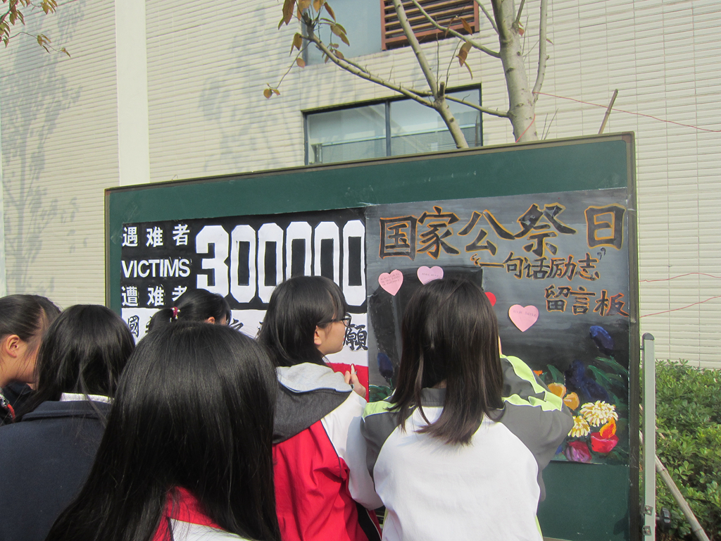 为郑重迎接本次国家公祭日的到来,学校于近期开展了一系列相关活动。11月下旬,学校团委积极响应团市委、市教育局关于国家公祭日主题教育的号召,在学校发起了“勿忘国耻、圆梦中国”主题征文、诗词楹联征集活动。三个校区的160多篇征文表达了同学们对这段惨绝人寰历史的铭记,对三十万死难同胞的深切缅怀以及对日益强大的祖国最美的祝福。此外,学生工作部、团委充分利用校园橱窗、宣传展板等再现了南京大屠杀的经过,并张贴了《南京市人民政府公告》和《国家公祭日鸣放警报期间机动车停驶鸣笛志哀交通安全提醒》。学校江宁校区在电子屏幕播放了《南京真相》纪录片,让同学们更为直接地了解历史。新街口、江宁校区校学生会干部们还组织了“国家公祭日,一句话励志”活动。同学们纷纷将自己对逝去者的缅怀之情、对国家的祝福写成一句句话贴在海报板上。