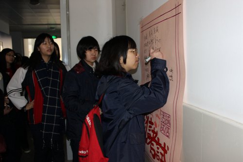 1月26到28日,校2014/2015学年第一学期期末考试即将举行。在期末考试即将来临之际,为了进一步推动诚信教育活动,贯彻学生道德教育,创造良好的考风、学风,学校会计系江宁校区学生会和新街口校区学生于近期分别开展了“诚信考试”签名活动和海报宣传活动。
