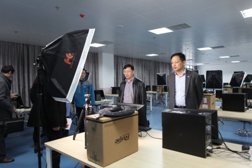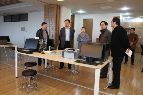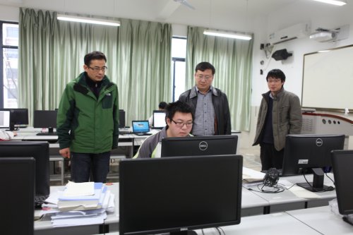 在学校陈旭辉校长和其他学校领导的陪同下,潘局长一行首先来到即将作为省信息类专业技能大赛比赛场地的各实训室进行了仔细的查看,并慰问了正在备战省赛的我校师生。