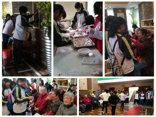 4月11日上午九点,在兰轩和蒋镜然两位班主任老师的带领下,51408、51409两班学子前往南京雅禾敬老院开展了“公益献爱心,孝敬老人”的社会实践活动。在敬老院里,志愿者们有的给老人捶腿按摩、有的热情地递上了水果,有的陪老人们聊天话家常,有的帮助老人们打扫卫生,一个个忙的不亦乐乎。不仅如此,志愿者们还带来了新鲜的蔬菜和肉,和老人们一起包水饺。当热腾腾的饺子饱含着志愿者的关怀送到老人手中时,大家可以感受到他们发自内心的那种喜悦,闪烁在眼眸里的那种光彩。饭后,志愿者们为老人表演了精心准备的节目:红歌演唱,歌曲串烧,广场舞《小苹果》……,昔日冷清的敬老院充满了欢声笑语。短暂的半天很快就过去了,志愿者们和敬老院的爷爷奶奶一一告别。走出敬老院,大家都忍不住回头看了几眼,不舍得离开,在他们的心里,那份温暖必将久久不会散去。