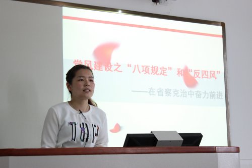 施慧娟老师的党课以《党风建设之“中央八项规定”和“反四风”》为题,以案例《“公款消费”提案》的呈现入手,通过分析浙江社会保障厅厅长统计“全年开会”的数据和山东蒙阴县委书记的自白文件,说明了八项规定的现实意义;以多张图片和照片为素材说明了反“四风”的紧迫性;通过数据对比、调查结果分析展现中国共产党落实“中央八项规定”,践行“反四风”的成效及意义。