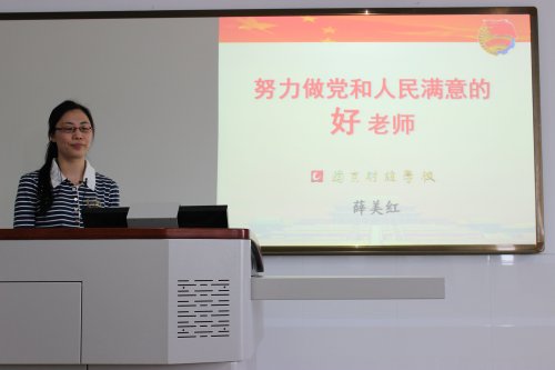薛美红老师的党课以《努力做党和人民满意的好老师》为题,开篇呈现了一段视频,即习近平在2014年9月9日同北京师范大学师生代表座谈时的讲话《做党和人民满意的好老师》中的一段话,从中概括出“好老师”的四有标准,即有理想信念、有道德情操、有扎实学识、有仁爱之心。接着,她以全国著名语文教育专家李吉林、最美教师张丽莉、面对歹徒以身护生的秦开美、坚持从事特殊教育的杨小玲等榜样人物的事迹,进一步诠释如何做一名“四有标准”的好老师。结束时,她再一次以习主任的“三寸粉笔,三尺讲台系国运;一颗丹心,一生秉烛铸民魂”来号召教师们成为培养实现民族梦想主力军的筑梦人。