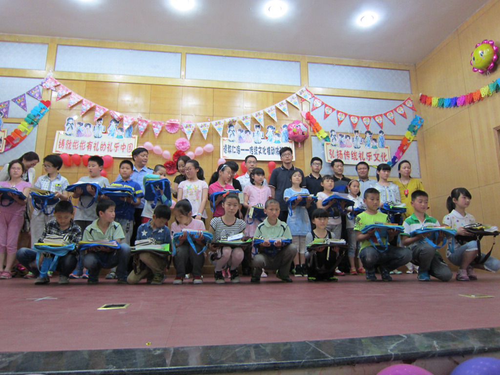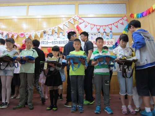 活动于下午两点在宁海中学体育馆举行。在汉服舞蹈《泸沽寻梦》、《礼仪之邦》,二胡、小提琴合奏的《赛马曲》,陶笛吹奏的《望春风》和《送别》等精彩的节目之后,隆重的捐赠仪式开始了。“爱之源”公益组织和其他学校捐赠了书、画等物品,而我校团委的志愿者们也带来了精心准备的“爱心拎袋”。拎袋中是团委委员们精心挑选的两本文学书籍、文具三件套以及一张精美的明信片,上写着“在六一儿童节到来之际,我们用爱呵护你的茁壮成长,用心陪伴你快乐学习。愿你可以带着梦想的翅膀,翱翔在广阔的天空”的字样。接过“爱心拎袋”的小朋友们脸上露出了喜悦的笑容。最后,所有志愿者们和这些可爱的孩子们拍照留念,用相机记录下这美好的一刻,快乐幸福的一天。
