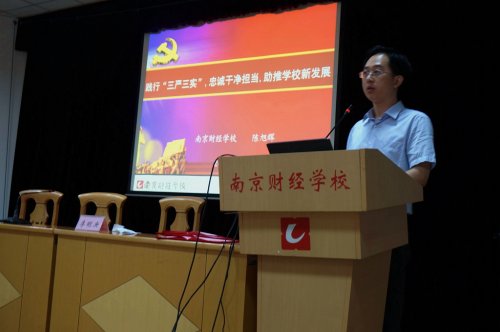 随后,校党委书记陈旭辉同志以《践行“三严三实”,忠诚干净担当,助推学校新发展》为题对全体党员上了专题党课,并对“三严三实”专题教育进行了汇报和部署。陈书记首先总结回顾了“三严三实”专题教育的背景,介绍了习近平总书记有关“三严三实”的五次重要讲话。他指出“三严三实”是群众路线教育实践活动的延展与升华,是全面从严治党的重要探索,是党的思想建党和制度治党的有机结合。接着,陈书记旁征博引,借用古今中外众多的名言与事例,阐述了“三严三实”的丰富内涵。然后,他辨证地分析了“三严”与“三实”的关系,指出“三严”是内在要求,是指向主观世界的改造,“三实”是行为取向,是指向客观世界的改造。陈书记还结合实际校情全面剖析了目前学校党员干部存在的八个方面“不严不实”问题,要求全体党员自我对照“三严三实”要求,从严从实做好工作,同时对全体党员提出了做好“六个表率”的希望。一是修身之本在于忠诚,做信念坚定,永葆党性的表率;二是用权之本在于规矩,做克己奉公,秉公用权的表率;三是律己之本在于干净,做自省自律,清正廉洁的表率;四是谋事之本在于务实,做脚踏实地,求真务实的表率;五是创业之本在于担当,做实干有为、主动作为的表率;六是做人之本在于诚实,做表里如一、公道正派的表率。会上陈书记还传达了市委教育工委关于开展“三严三实”专题教育“四专题四强化”的要求,对“三严三实”专题教育进行了具体部署。