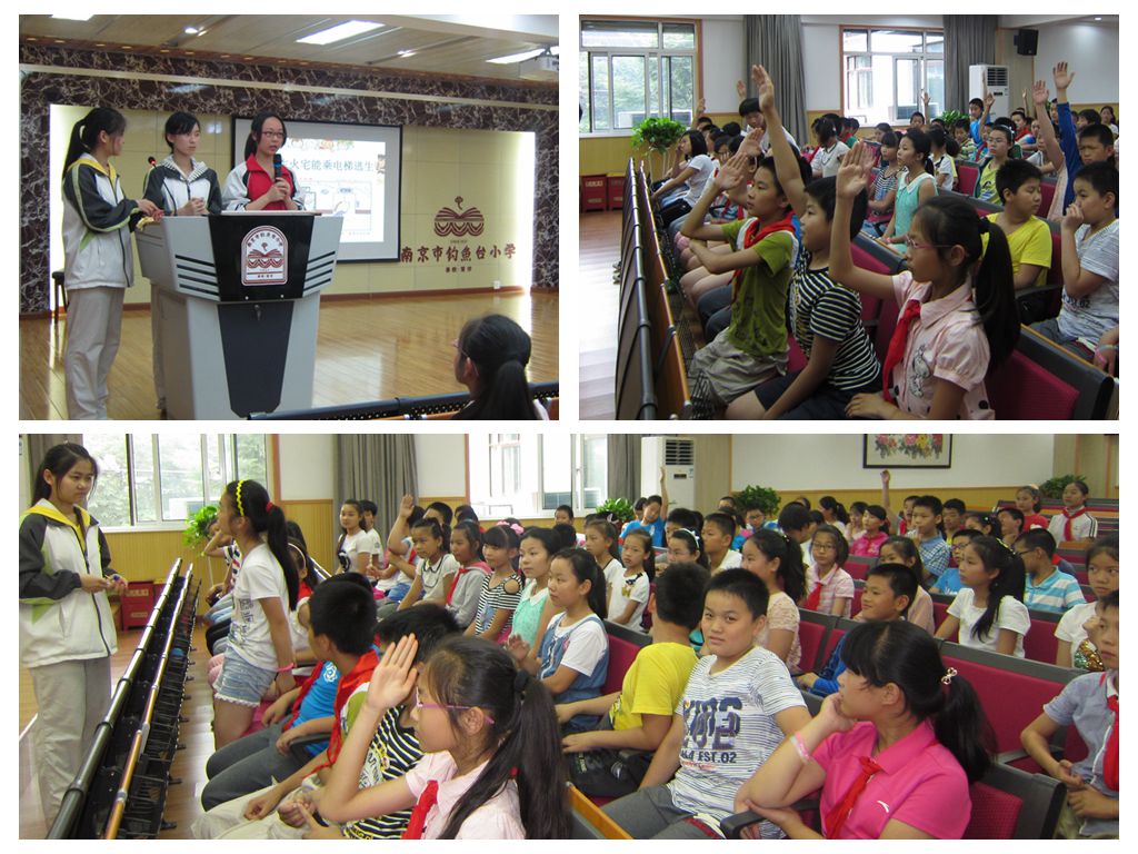 此次安全教育宣传演讲对象为钓鱼台小学五年级的学生,共三个班级。志愿者们制作了精美的PPT,从交通安全、用电安全、家庭防火、游泳安全、饮食卫生、防暑降温和人身安全等七个方面为小朋友们进行了全面系统的讲解,通过图片展示、视频演示、小品表演和举手抢答等方式让同学们在趣味的互动中了解生活中存在的安全隐患,并学会基本的自我安全防护措施。活动开始前,志愿者们首先进行了自我介绍并用逗趣的开场方式与到场的学生们打招呼,使整个报告厅的气氛一下变得轻松愉悦起来。活动过程中,互动问题抢答环节的场面更是激烈火爆,同学们积极踊跃,争相举手进行抢答。甚至一题结束后,大多数同学都不肯把手放下,生怕错过下一题的抢答。志愿者们也为正确回答问题的同学们带来了小礼品进行奖励。