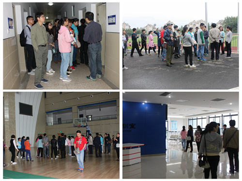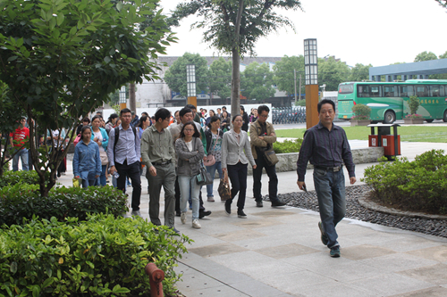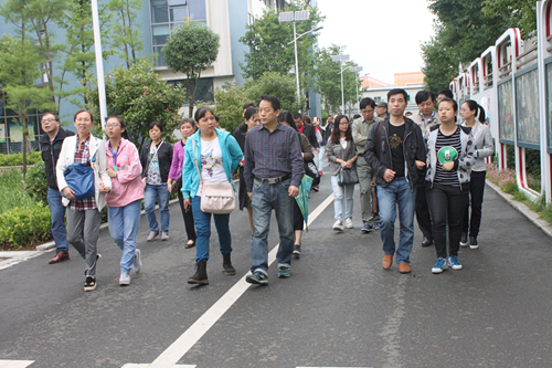 愉快的交流中时间飞逝,很快就来到了美丽的湖熟校区。一下班车,家长们就被江宁校区的主干道绿化吸引了眼球,翠绿的竹篱、墨绿的草地、红的黄的花,交相呼应。在接下来的行程中由学工部副主任陈阳、后勤部主任朱春健带队参观及讲解。家长们对于餐厅、宿舍、体育馆、操场、教室、实训室等学生校园活动中的主要场所都表示很满意,有些家长情不自禁地拿出了手机等电子设备进行拍摄。